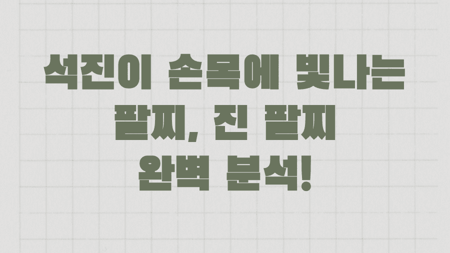 안녕하세요! 여러분의 패션 레이더, 오늘은 우리의 자랑스러운 BTS 진, 김석진 님의 손목을 빛내준 팔찌에 대해 파헤쳐 볼 시간입니다. 아미라면 누구나 한 번쯤 석진 님이 착용한 팔찌를 보며 ‘저거 어디 거지?’ ‘나도 저런 스타일 하고 싶다!’라고 생각해보셨을 거예요.